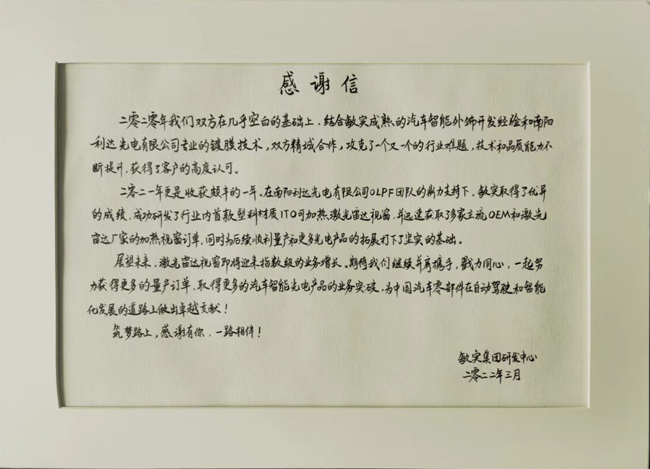 | ??????? 2022年6月30日,敏實集團采購總監(jiān)、研發(fā)中心-中心實驗室總監(jiān)、研發(fā)中心-智能內(nèi)外飾創(chuàng)新中心研發(fā)總監(jiān)一行來訪利達光電(以下簡稱公司),在公司舉行了【最佳合作伙伴】授獎儀式,并向公司頒發(fā)感謝信。 |